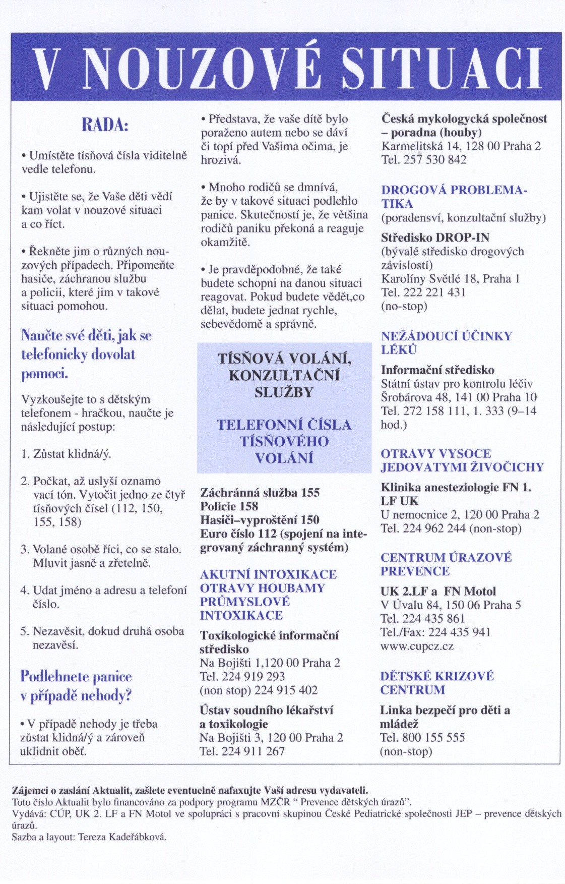 Typ: 3 dílná barevná skládačka. Vydal: Centrum úrazové prevence, UK 2. lékařská fakulta a FN Motol, 2003