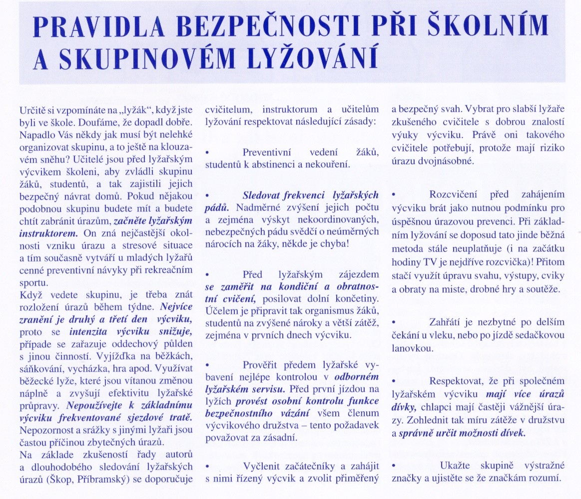 Pokud jezdíte rádi na hory a patříte k příznivcům sjezdového lyžování a snowboardingu, měli byste vědět, že i na sjezdovkách podobně jako například v silničním provozu platí určitá pravidla. tato pravidla koncipovala Mezinárodní lyžařská federace FIS. největší počet nehod na sjezdovkách je způsoben srážkami. Není divu, když nejméně patnáct procent lyžařů si myslí, že na lyžích platí stejně jako na silnici pravidlo přednosti zprava! Seznamte se proto s bezpečnostními pravidly: