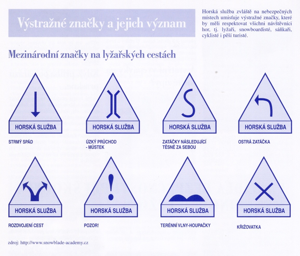 Horská služba zvláště na nebezpečných místech umisťuje výstražné značky, které by měli respektovat všichni návštěvníci hor, tj. lyžaři, snowboardisté, sáňkaři, cyklisté i pěší turisté.