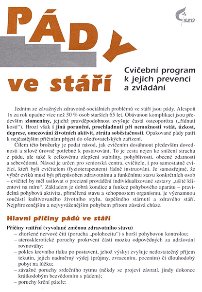 Materiál obsahuje souhrn hlavních příčin pádů ve stáří, možnosti jejich předcházení a nácvik posilování svalů. Brožura obsahuje navíc zásady správně prováděného cvičení, nejčastější chyby při cvičení. Cvičební programy jsou doplněny kreslenými obrázky, jak provádět cvik.